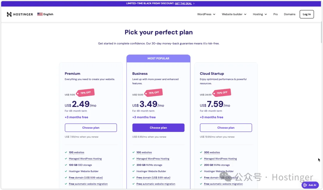 Hostinger正在进行2024年黑色星期五的促销活动,这次提供了非常有吸引力的折扣,尤其适合需要云托管和VPS的用户。针对 Cloud Startup 和 VPS 计划,最高可享 77% 的折扣,这些优惠非常适合创业公司和需要高性能服务器的业务